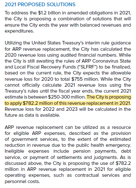 The budget forecast not only projects the city’s 2022 finances, but provides an update to the current, fiscal year 2021 budget. The city is now projecting that it has a $1.2 billion deficit in the current fiscal year, and a main way the Mayor is proposing to close that budget gap is to use a portion of Chicago’s ARPA aid. Here is how it is explained in the 2022 forecast document (emphasis added):