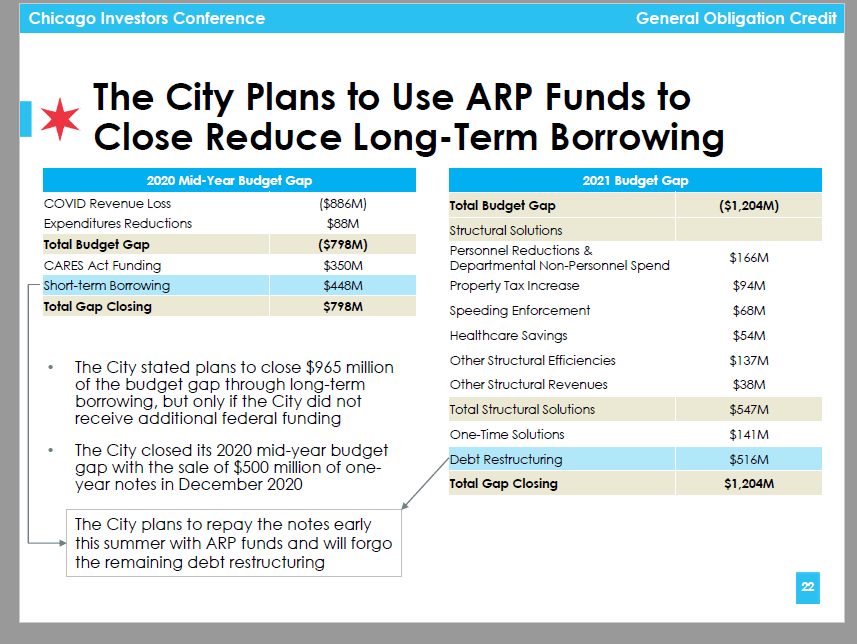 One reason the Mayor’s ARPA spending plans are confusing for a general audience is that the discourse used to explain the plans is largely directed at the municipal bond market, including credit rating agencies, bank underwriters, and investors. For example, city officials explained the plans at an investor conference it hosted in May 2021. That event was an invitation-only virtual conference for “bondholders, real estate investors, and financial stakeholders” during which the city would provide the “municipal market” with insights into how it planned to use the ARPA aid. (side note: Rahm Emanuel held the first investor conference in 2011 and it was part of a larger effort “to improve communications with the financial community and boost investor interest” in Chicago.)