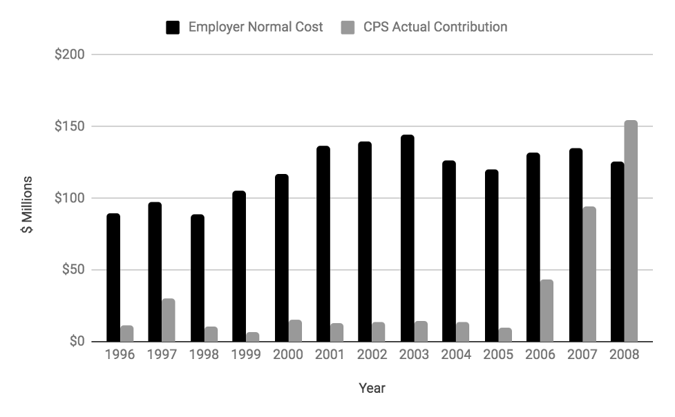 Then in 1997, subsequent state legislation (Public Act 90-548) was passed that changed how the CTPF was funded (another form of “financial flexibility”). The new provision specified that the CBE did not have to pay more into the CTPF than was required to keep the CTPF 90% funded, which meant that when the CTPF’s funding level was at least 90%, the CBE paid virtually nothing into the CTPF. This violates prudent pension funding policy in two ways. As previously mentioned, the industry standard is to strive for full funding. Second, this meant that the CBE wasn’t even covering the cost of benefits earned by current employees (the “normal cost”). The normal cost should always be paid. In a nutshell, rather than being paid for by annual contributions from the CBE these costs were being paid for with CTPF’s existing assets (and investment returns). It wasn’t until 2008, that the CBE’s contribution to CTPF covered the employer share of the normal cost.