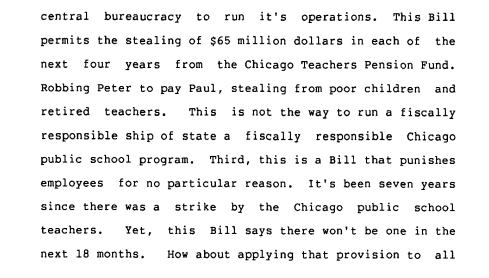 A final important thing the 1995 law did is that it changed the CTPF funding law and made it identical to the state pension systems’ pension ramp. Under this new funding law the CBE’s contributions to the CTPF, as a percentage of payroll, would increase between 1999 and 2010, and then from 2011 through 2045 the contributions would be sufficient so the CTPF would be 90% funded by the end of fiscal year 2045. The result was this cut how much money the CBE had to contribute to CTPF, freeing that money up for other uses. Representative Currie spoke out against this change during the House debate as highlighted in the passage below (p. 50 from the House transcript).